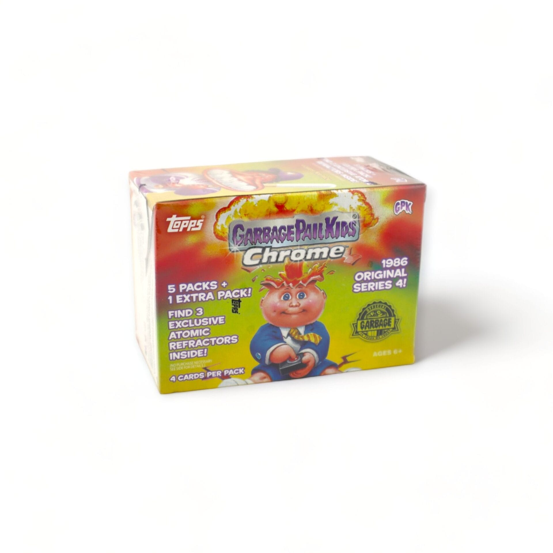 Relive the nostalgia and excitement of the 1986 Original Series 4 with our exclusive set. Unwrap 5 packs plus 1 extra pack per box, each containing 4 cards, including 3 exclusive Atomic Refractor Cards. Experience the thrill of collecting with the Garbage Pail Kids Chrome 1986 Original Series 4, Trash Can Children Chrome 1986 Original Series 4, and Rubbish Bin Kids Chrome 1986 Original Series 4.