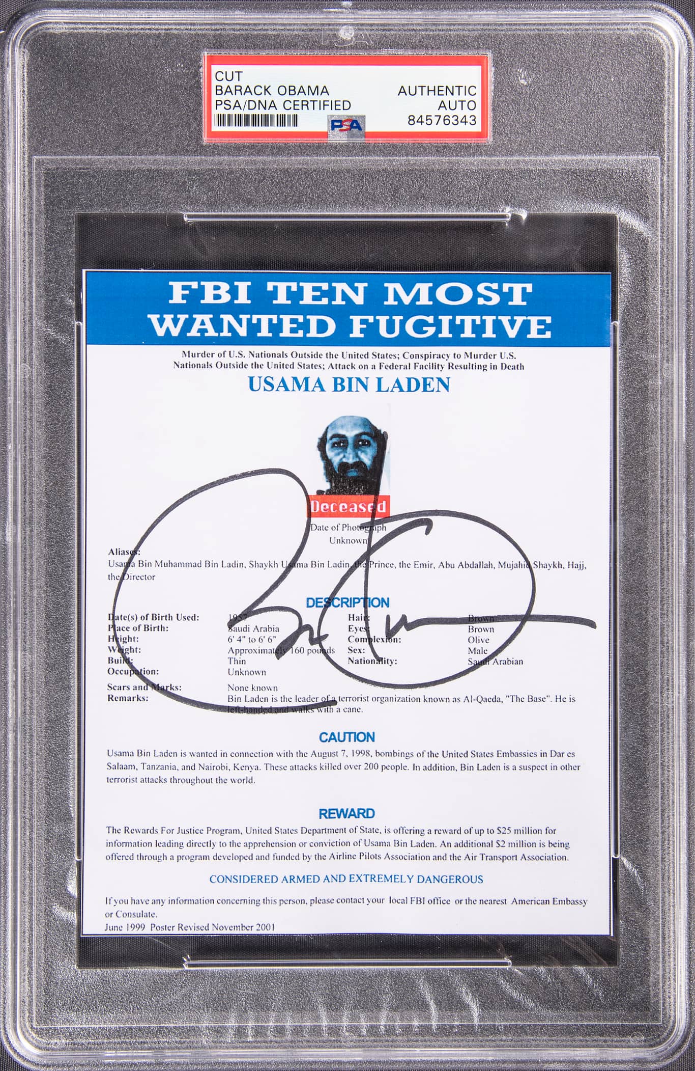 Encapsulated by PSA, with signature certified “AUTHENTIC” by PSA/DNA (84576343). In early 2011, President Barack Obama authorized “Operation Neptune Spear,” the May 2, 2011, raid led by U.S. Navy SEAL Team Six on wanted terrorist mastermind Osama bin Laden’s compound in Abbottabad, Pakistan. Bin Laden, the leader of Al Qaeda, orchestrated the terrorist attacks on Sept. 11, 2001, that took 2,977 innocent lives-he had eluded capture for nearly a decade. Cornered in his compound, the fugitive was finally brought to justice when he was eliminated during the raid, concluding the largest manhunt in American history.