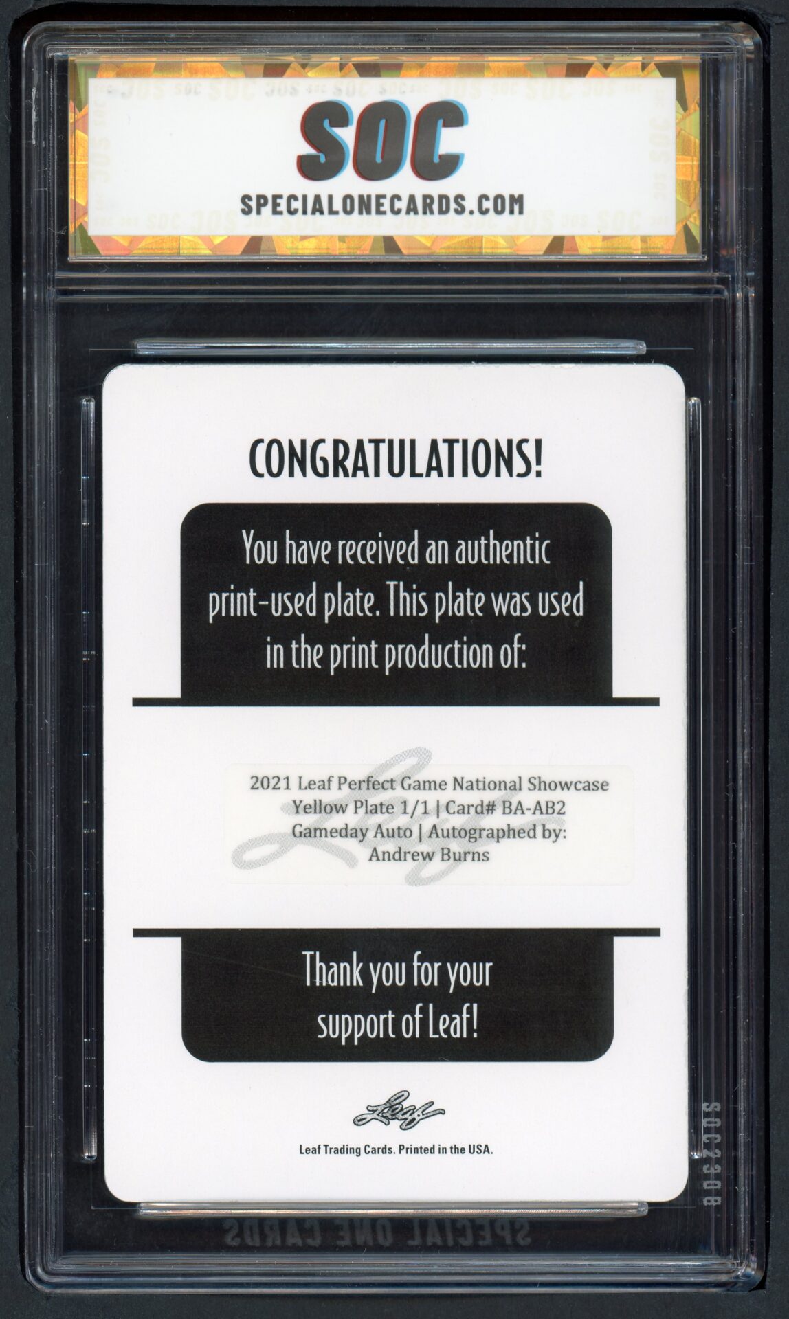 2021 LEAF #BA-AB2 ANDREW BURNS PERFECT GAME NATIONAL SHOWCASE SOC POP1